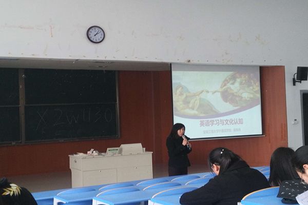 3月29日下午两点在A1W301教室,基础教学部特邀安徽工程大学外国语学院张凤梅副教授为学生开展主题为“英语学习与文化认知”主题讲座,通过大量英语词汇,分析背后文化内涵,揭示西方文化两大源头——希罗文明与基督教文明对今日英语形成的影响。