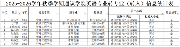 各学院:根据《安徽信息工程学院学生校内转专业管理办法》(校教字〔2025〕7号)和《关于2025-2026学年秋季学期学生校内转专业工作安排的通知》(教字〔2025〕121号)要求,我院英语专业的转专业面试已于2025年11月12日结束。此次转专业面试共录取8名学生,现将转专业(转入)面试结果予以公示(该名单不以面试成绩排序):公示时间:2025年11月13日—11月15日如对公示内容有异议,请以书面、署名形式向我院反映。反映人必须用真实姓名,反映情况需实事求是、客观具体。联系方式如下:联系人:黄老师联系电话:0553-8795073电子邮箱:jwhuang13@iflytek.com 通识教育与外国语学院2025年11月13日